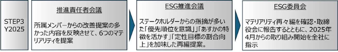 ・ESG委員会はESG推進会議の提案内容を審議・決定し、取締役会に報告したうえで、2025年4月からの取り組み開始を全社に指示しました。