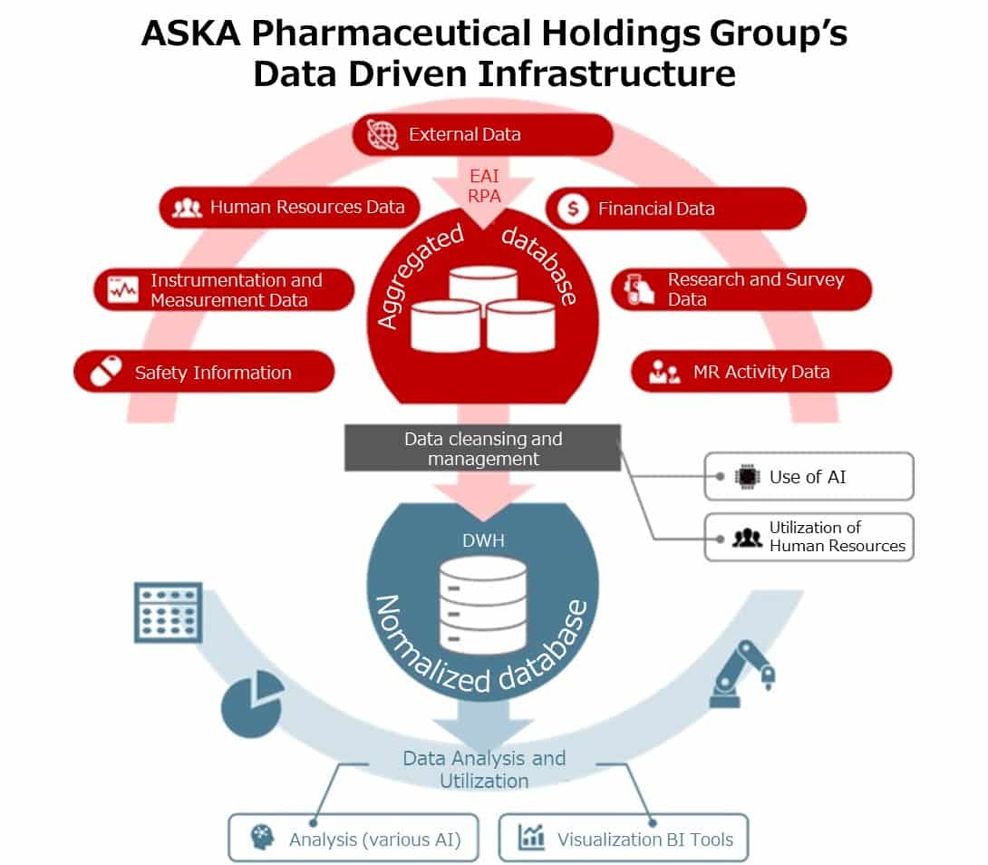 The ASKA Pharmaceutical Holdings Group's vision for DX is to “contribute to people's health and society by strengthening the value chain of pharmaceutical provision through the use of data and digital technology to review traditional business processes and create new value".