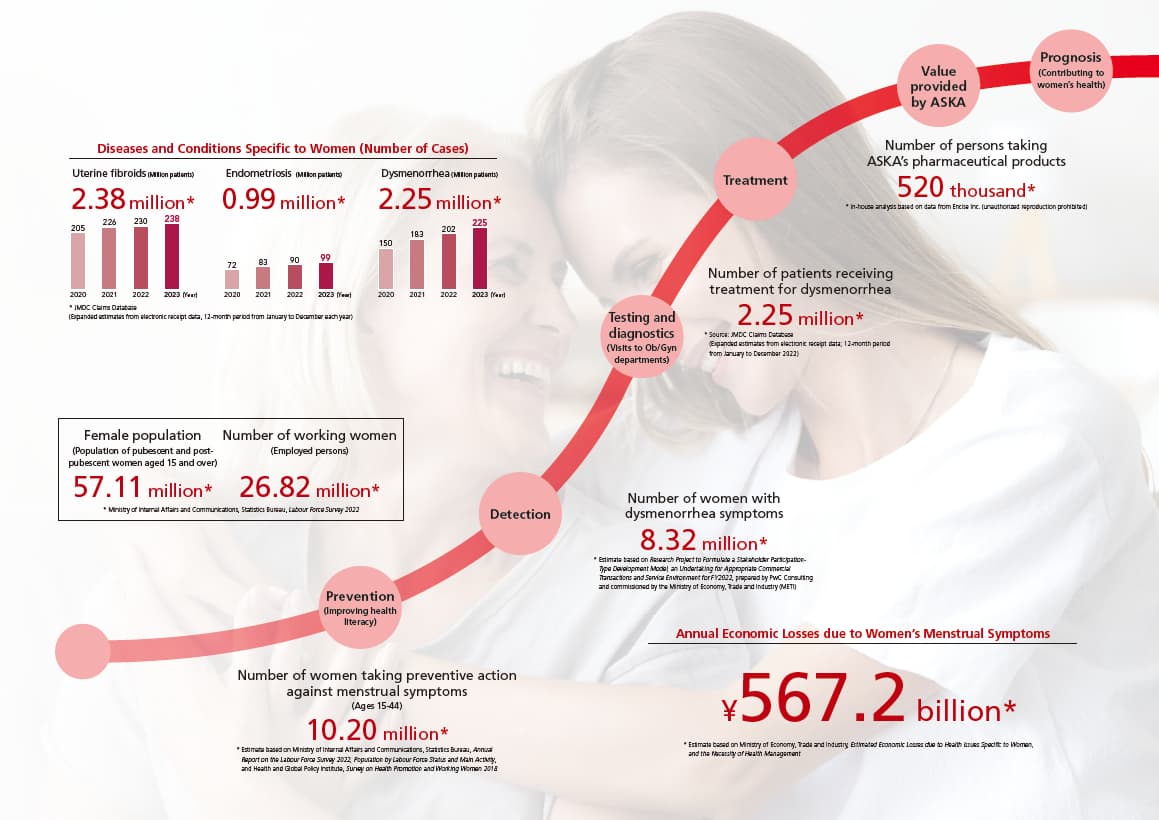 By providing a wealth of medicines alleviating women’s menstrual symptoms in its capacity as a leading company in the Ob/Gyn field, ASKA Pharmaceutical helps to reduce such losses by an estimated ¥42.8 billion annually.