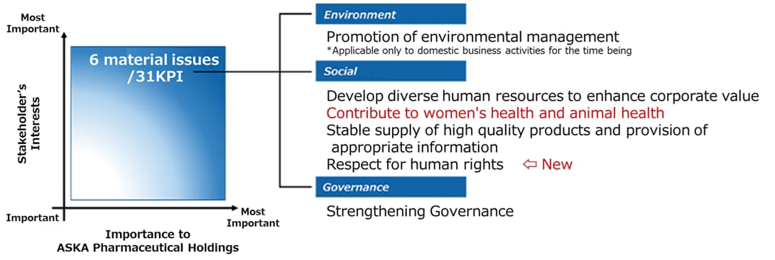 "The ESG Committee interviewed external experts and identified 17" "material issues" "as the most important issues and 41 associated KPIs, taking into account various guidelines and norms such as the GRI Standards, the SDGs, the medium-term management plan, and the interests of stakeholders." In addition, taking into account the relationship with our business and the perspective of social contribution, we positioned "contribution to women's health" and "contribution to animal health," in particular, where we can demonstrate our strengths, as our characteristic material issues, and after reporting to the Board of Directors, we instructed the entire company to start initiatives in October 2021.