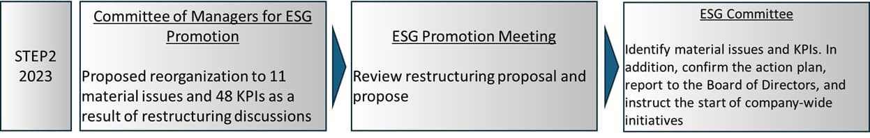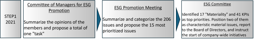 Approximately 2 years after STEP1, the ideal number of material issues/KPI items, specific targets and goals were set. In addition, as a result of discussions on reorganization at the Committee of Managers for ESG Promotion the purpose of understanding stakeholders, in-house penetration, and raising awareness, the reorganization into 11 material issues and 48 KPIs was proposed to the ESG Promotion Meeting.
