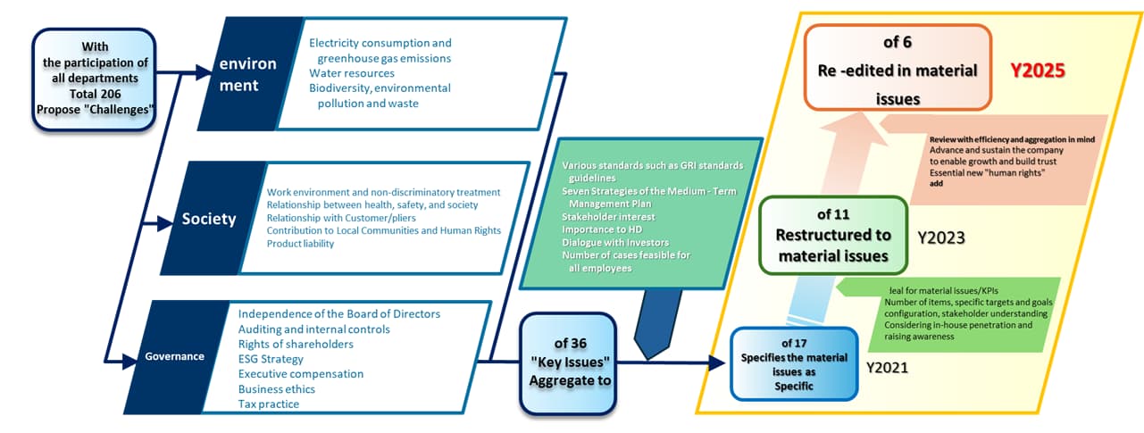 At the ESG Promotion Meeting, the Company proposed six material issues to the ESG Committee, taking into account the following matters, which have been particularly pointed out in communication with stakeholders.