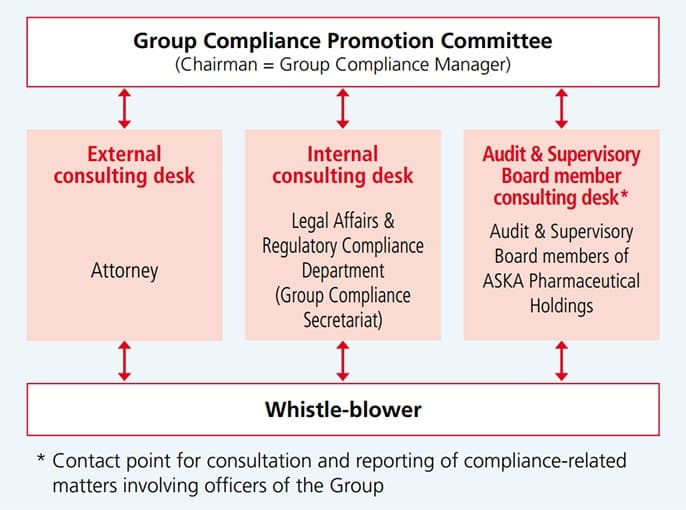 In addition to the existing internal and external contact points, we have established a new contact point staffed by ASKA Pharmaceutical Holdings’ Audit & Supervisory Board members (the Audit & Supervisory Board member consulting desk) for consultation and reporting of compliance-related matters involving Board Members of the Group (in connection with the enforcement of the revised Whistleblower Protection Act on June 1, 2022). This contact point, which is independent from senior management, is intended to lower the psychological hurdle for Board Members and employees for consultation and reporting of compliance-related matters involving senior management, and to ensure that investigations and corrective measures are carried out in a timely and appropriate manner. Reporting can be also done anonymously, and all cases are handled appropriately.